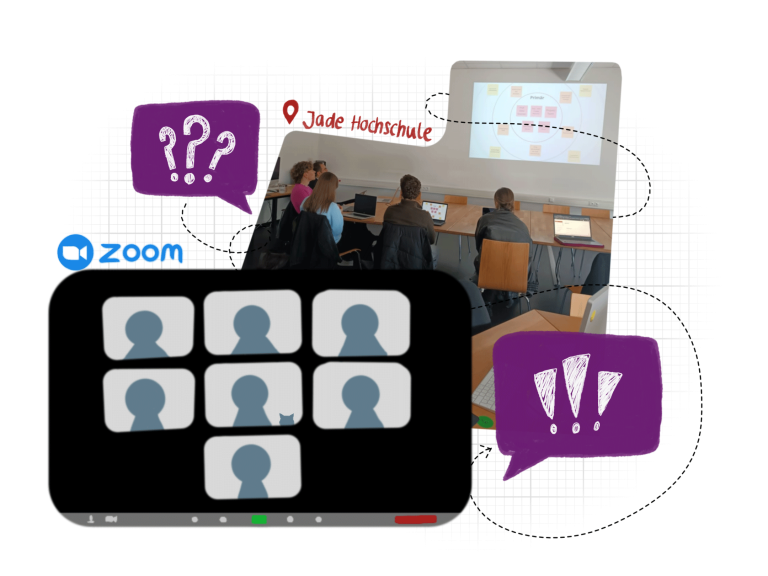 Ein wichtiger Bestandteil des Projekts waren die Vorlesungen sowie die Besprechungen im Team und mit Prof. Dipl.-Des. Götz Greiner. Hierfür trafen wir uns jeden Donnerstag in unserem Projektraum an der Jade Hochschule in Wilhelmshaven, um uns gegenseitig auf den neuesten Stand zu bringen, den Arbeitsstand zu erörtern und das weitere Vorgehen zu planen. War ein persönliches Treffen nicht möglich, fanden die Besprechungen alternativ in Online-Meetings über Zoom statt.